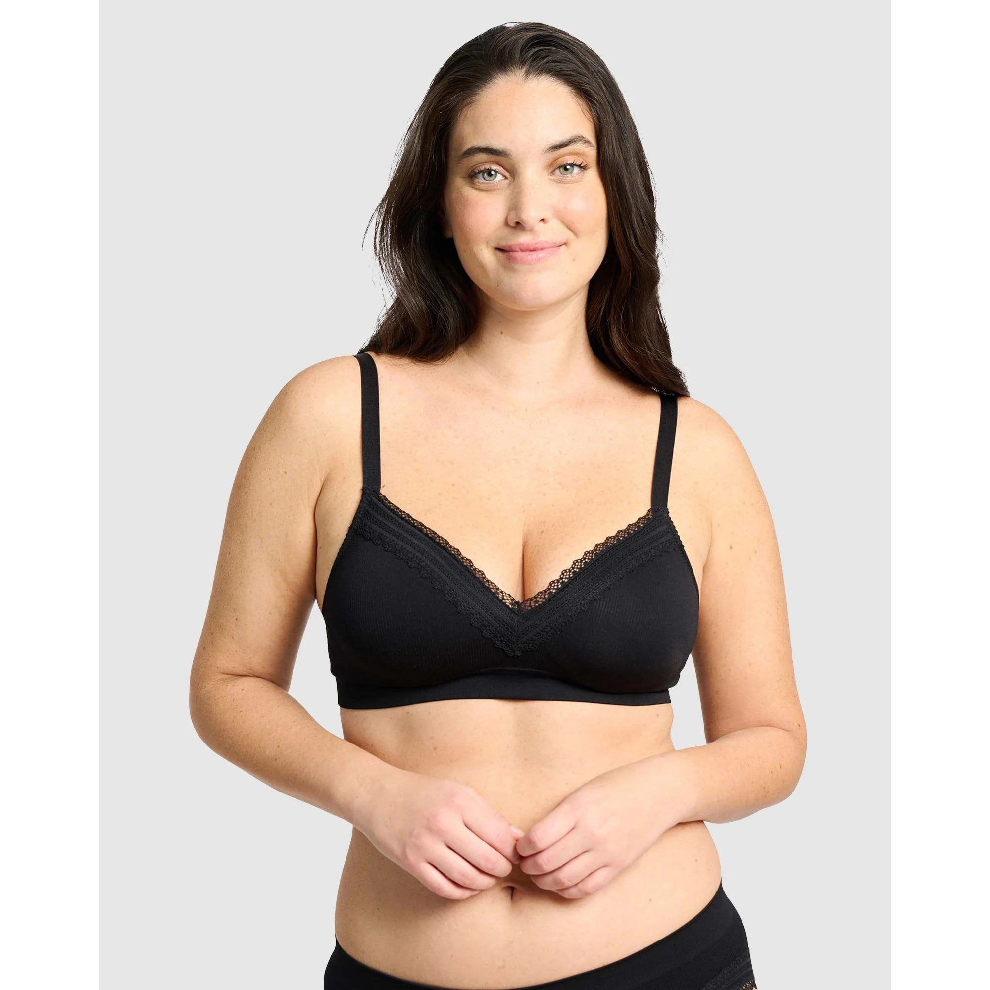 Designed especially for fuller busts, you'll love the flexible fit and super soft comfort of this padded wirefree bra, which is made from a circular knit fabric with a finely ribbed texture. Trimmed with lace around the V neck for a pretty touch, the moulded interior and seamless outer combine to ensure it stays invisible under your clothing.