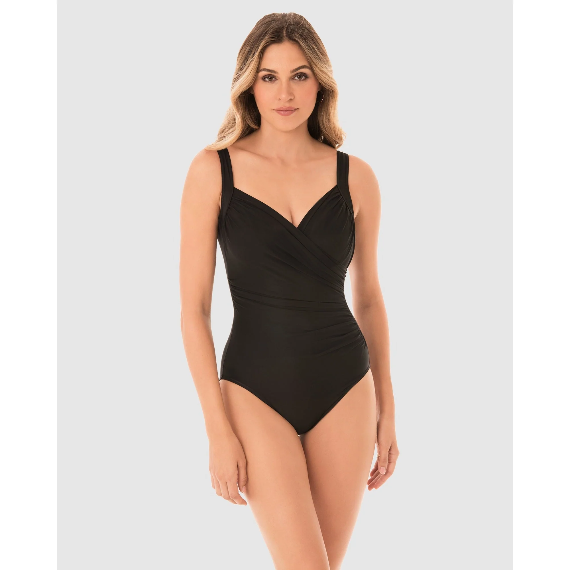 Feel fabulous at the beach in this one piece swimsuit with hidden underwire, and built-in shaping. Made from Miraclesuit's lightweight-yet-powerful Miratex fabric, it provides all-over smoothing and slimming. Cleverly-placed ruching fans out from one side, tricking the eye into seeing a more hourglass-y silhouette. The crossover design creates a sweetheart neckline, which is framed by wide shoulder straps.