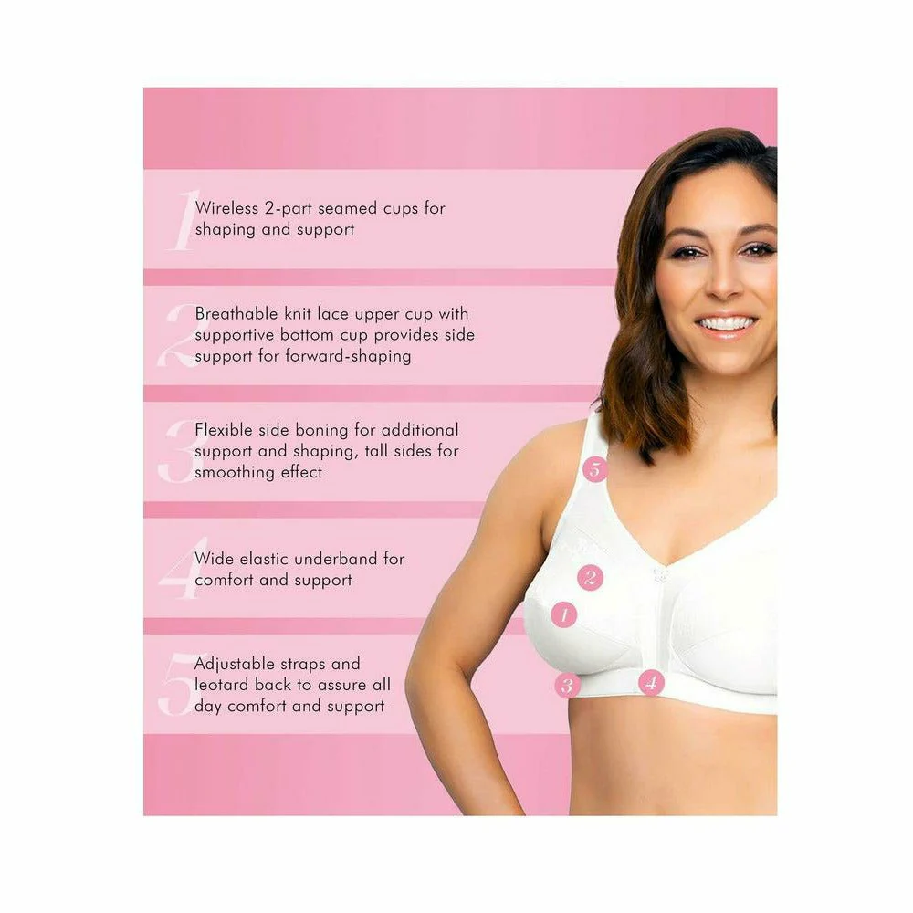 Enjoy soft, all-day comfort with this supportive wireless bra, which offers full-coverage cups that gently shape and support your bust. These wirefree cups are seamed for depth and feature side panels that bring your bust tissue inwards, for an overall narrower, slimmer-looking silhouette. This is also a side smoothing bra, thanks to tall sides with firm-but-comfortable boning. The fabric has a stylish satin finish, complemented by a lace overlay on the cups and an embroidered flower at the neckline.