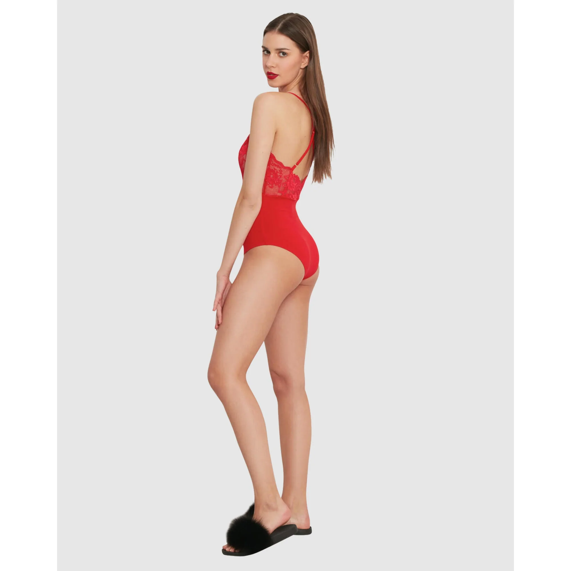 As comfortable as it is sensual, this lingerie bodysuit is crafted from a mixture of soft, skin-friendly viscose fabric and sheer stretch lace. The scalloped edge of the lace beautifully frames the V neck, leading into narrow, adjustable straps that cross over at the back.